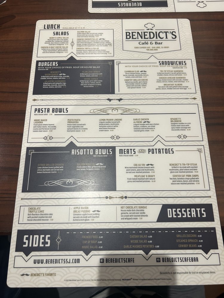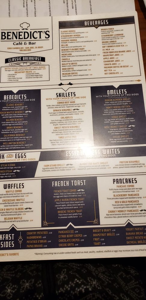 Welcome to Benedict’s Cafe & Bar, your go-to destination for a delightful American breakfast and brunch experience in San Jose. This inviting cafe, located at 5365 Camden Ave, specializes in an array of dishes tailor-made for any meal of the day. Notable highlights from the menu include the Chicken Waffle Benedict, a decadent twist on the classic, and the mouthwatering Monte Sereno Frittata, rich with Italian sausage and fresh vegetables.